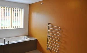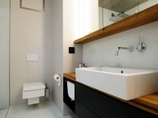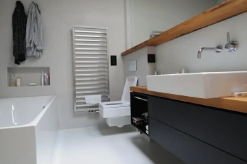 Na stěny aplikujeme tradiční cementovou stěrku s výraznou strukturou zdůrazňující ruční řemeslo, nebo velmi minimalistickou blížící se pohledovému betonu.